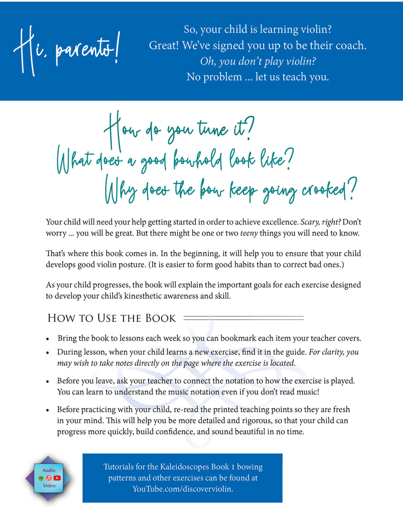 The parent guide, entitled The Balanced Violinist: Technique Companion to Kaleidoscopes Book 1, provides detailed instructions for students as well as parents. Posture, bowhold, pre-playing exercises, and technical exercises are all clearly detailed with beautiful photography. This guide combines previous volumes into one convenient and elegant book. 84 pages.