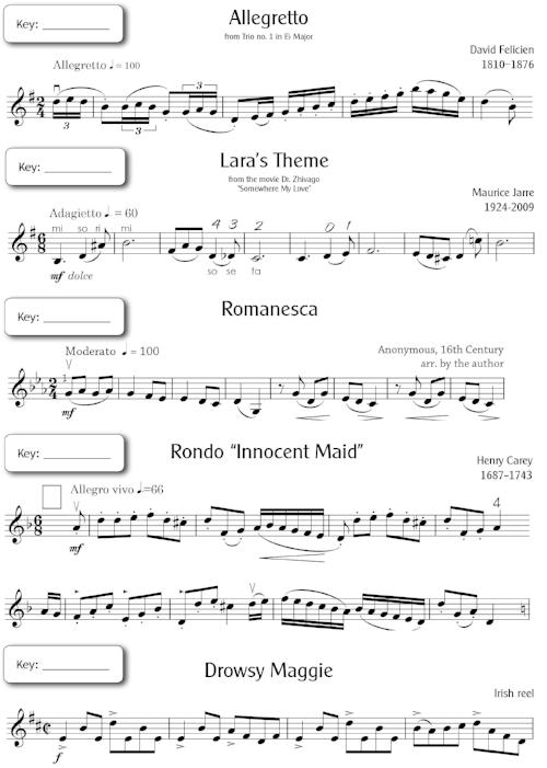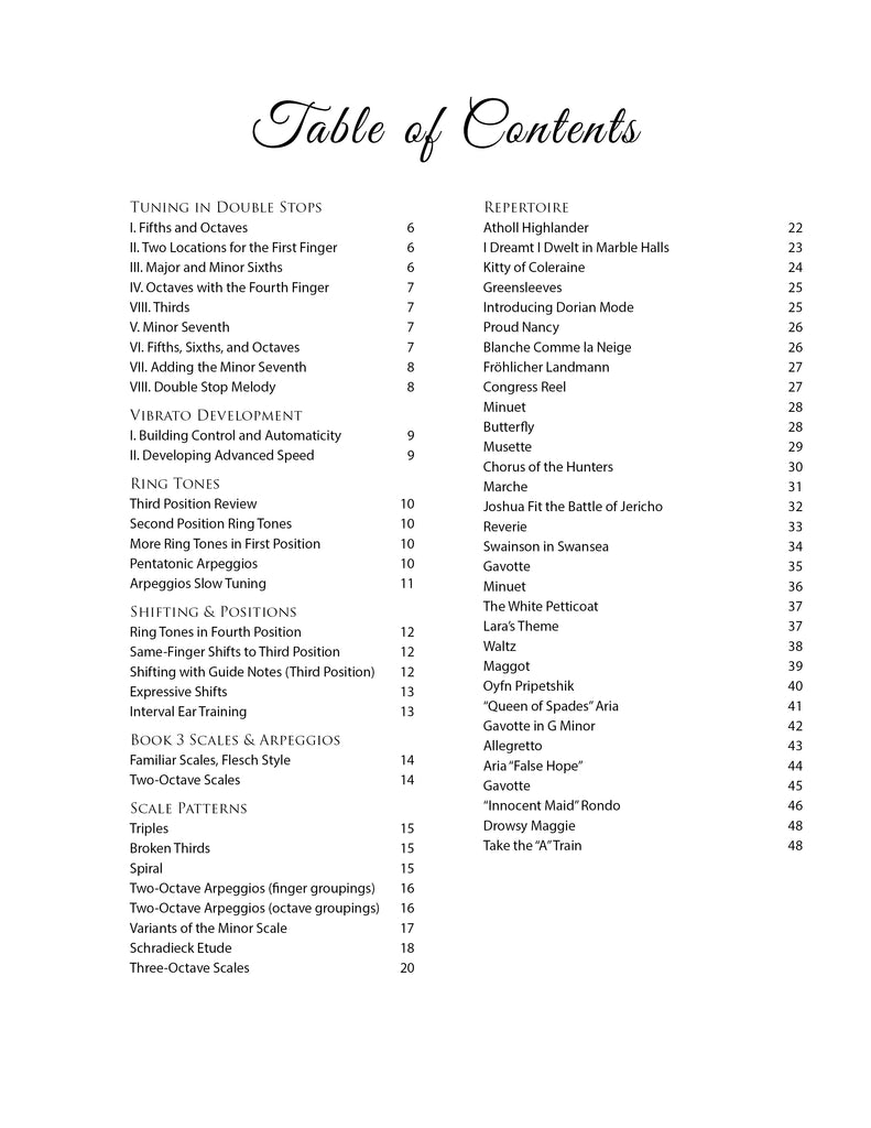 The book gradually moves toward longer pieces with contrasting sections, second position, and greater key flexibility.